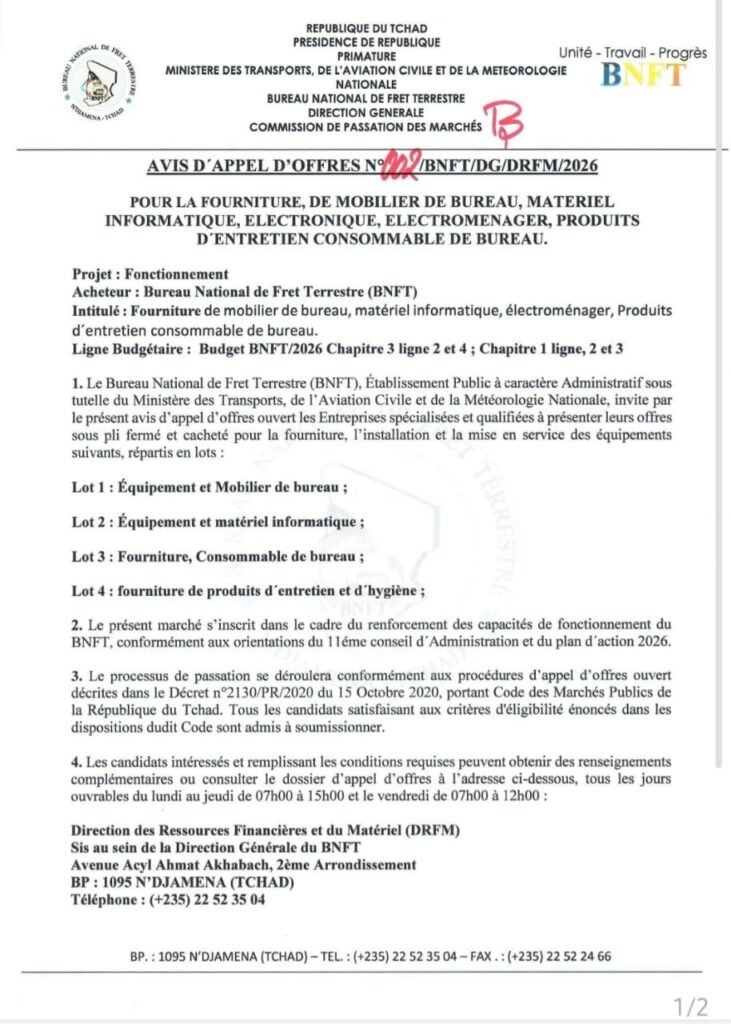Le Bureau National de Fret Terrestre (BNFT) lance un appel d’offres pour l’acquisition de mobilier de bureau, matériel informatique, électronique, électroménager et produits d’entretien.